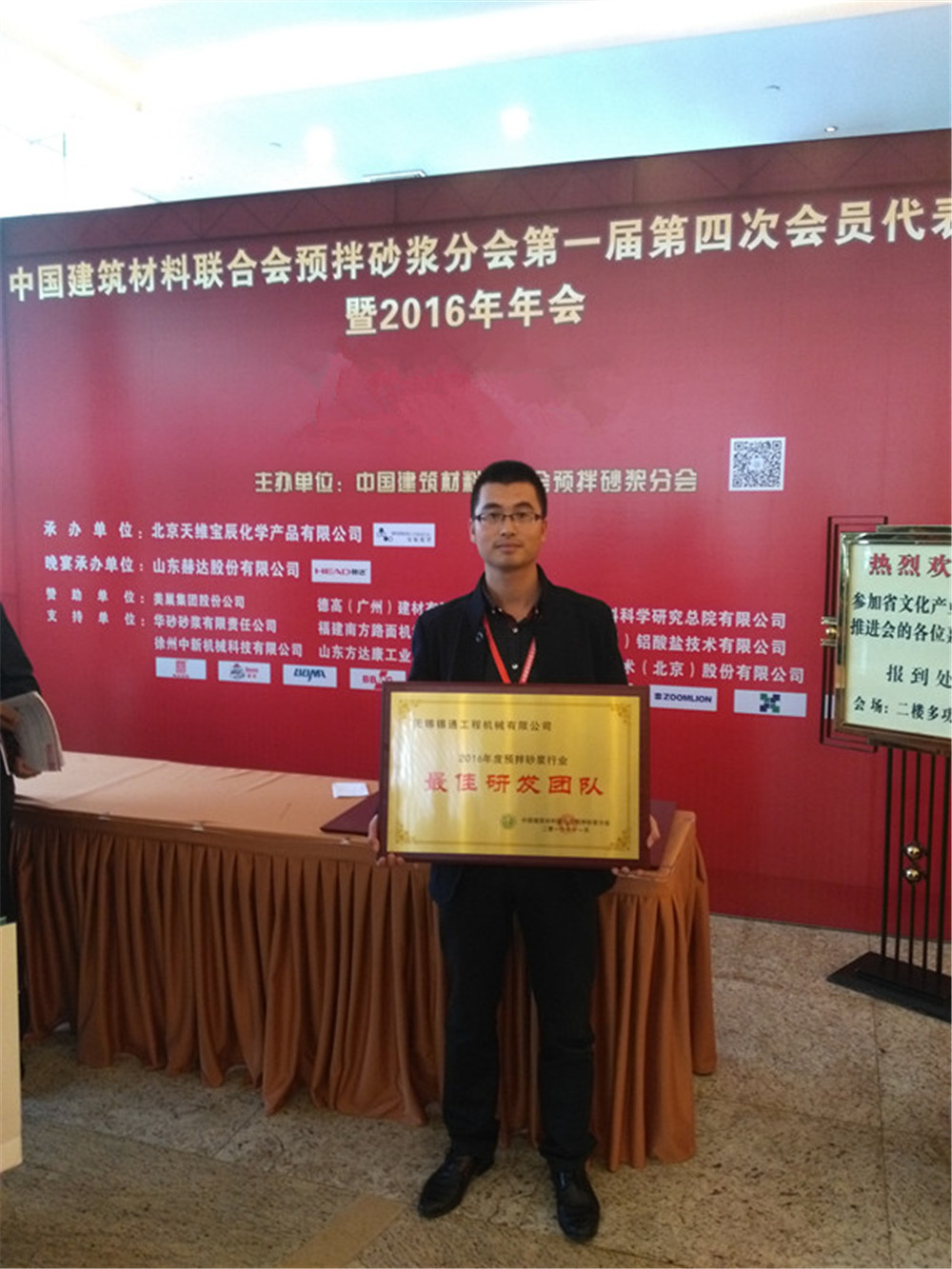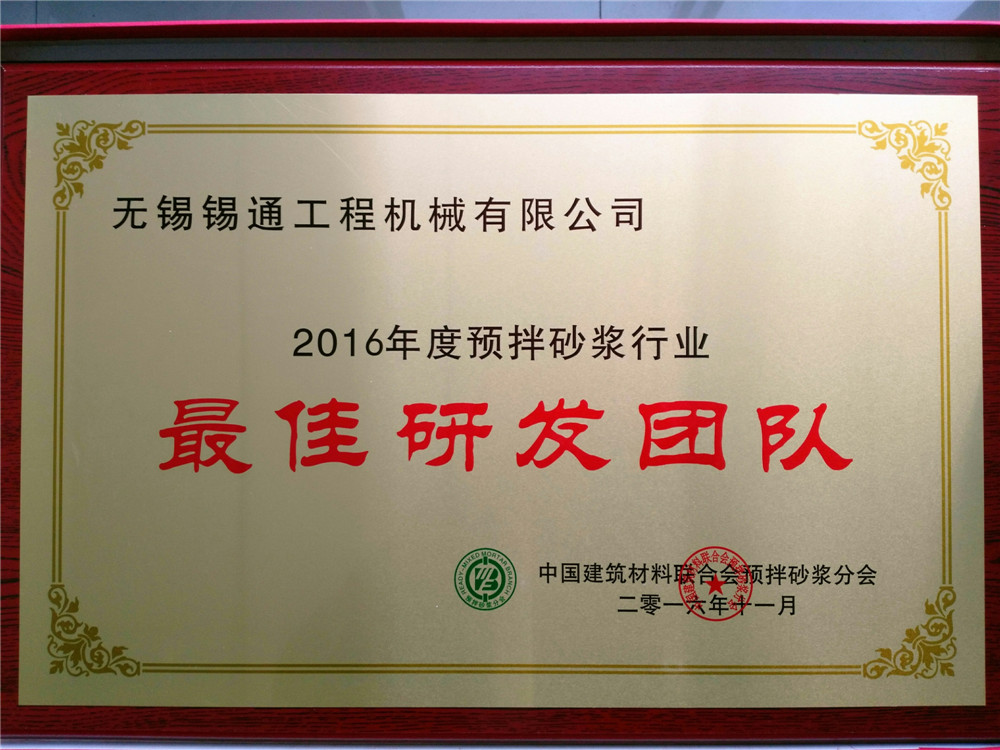 2016年11月10日,中國建筑材料聯合會預拌砂漿分會第一屆第四次會員代表大會暨2016年年會在南京華東飯店順利召開,錫通公司憑借精湛的研發隊伍和歷年來在科研上的投入,獲得中國建筑材料聯合會砂漿分會頒發的《2016年度預拌砂漿行業最佳研發團隊》榮譽稱號,獲此殊榮,既是對錫通研發投入的肯定,也是對錫通設備技術水平的肯定。