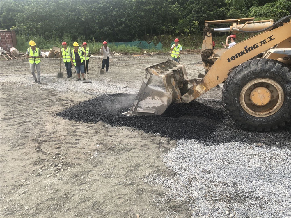隨著軟簾門的緩緩升起,裝載機裝著第一鍋料緩慢傾倒在了地上并被鋪開,瀝青混合料的質量受到了榕圣公司領導的肯定。而后,榕圣公司領導發表講話,并宣布剪彩儀式順利完成!